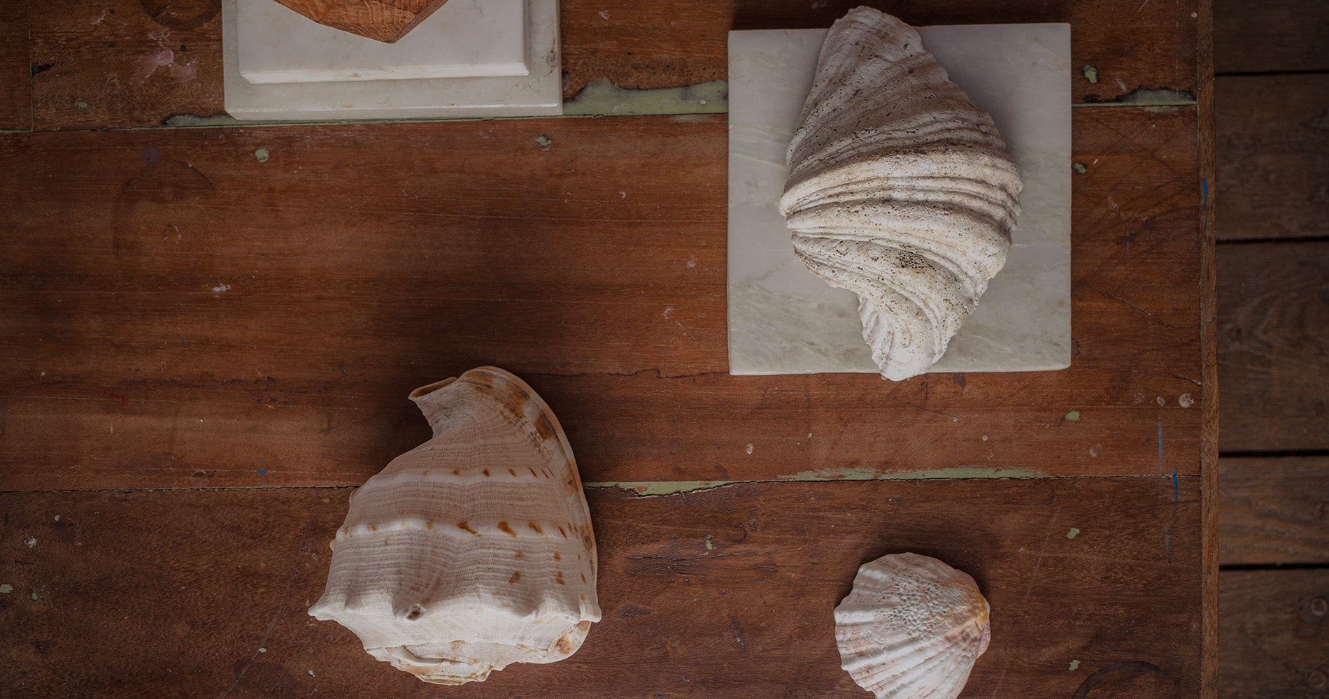 A gingham print in navy hue adorned with hand-drawn shells — like a net bag full of the collected treasures from the shore.